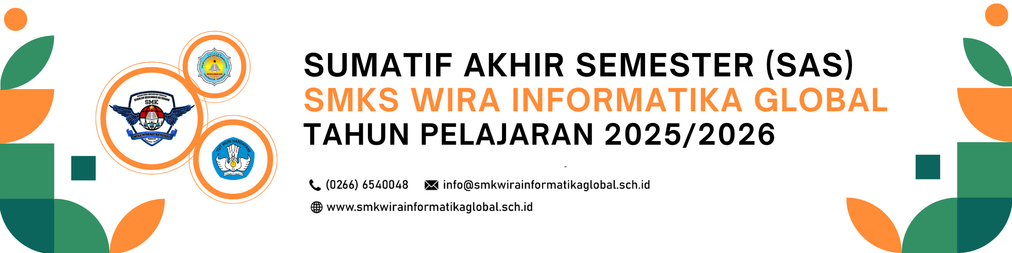 Seluruh Soal Penilaian Sumatif Akhir Semester (SAS) Teori SMKS Wira Informatika Global Tahun Pelajaran 2025/2026 yang diselenggarakan secara daring (online disekolah) akan di unggah pada website resmi SMKS Wira Informatika Global berdasarkan jadwal yang telah ditentukan